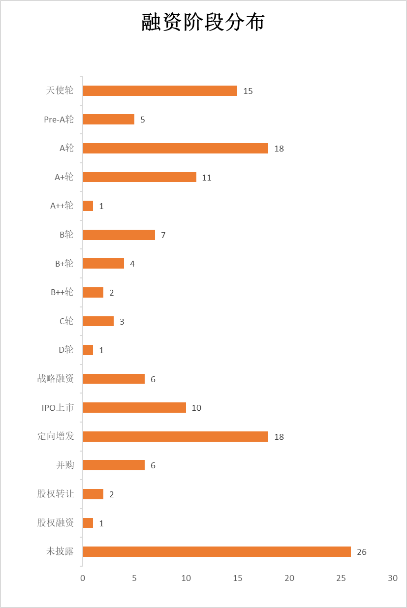 从融资阶段分析,国内项目主要分布在A轮(除定增外),为18起融资事件,占国内总融资笔数的13.2%。