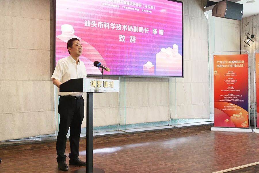 汕头市科技局副局长陈昕在开班仪式上致辞,鼓励企业抓住科技金融发展高级研修班在汕头举办的机会,深入了解有关政策,借力资本市场加快创新发展。